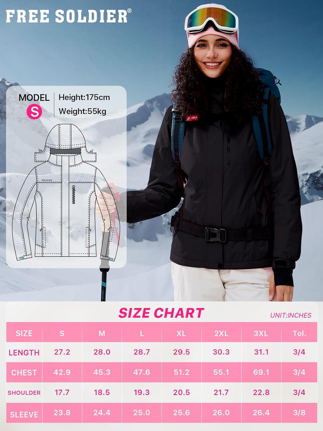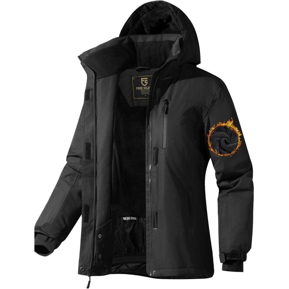 FREE SOLDIER Women’s Waterproof Ski Snow Jacket Fleece Lined Warm Winter Rain Jacket with Hood Fully Taped Seams(Black)