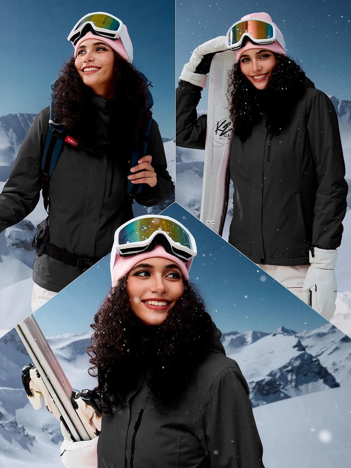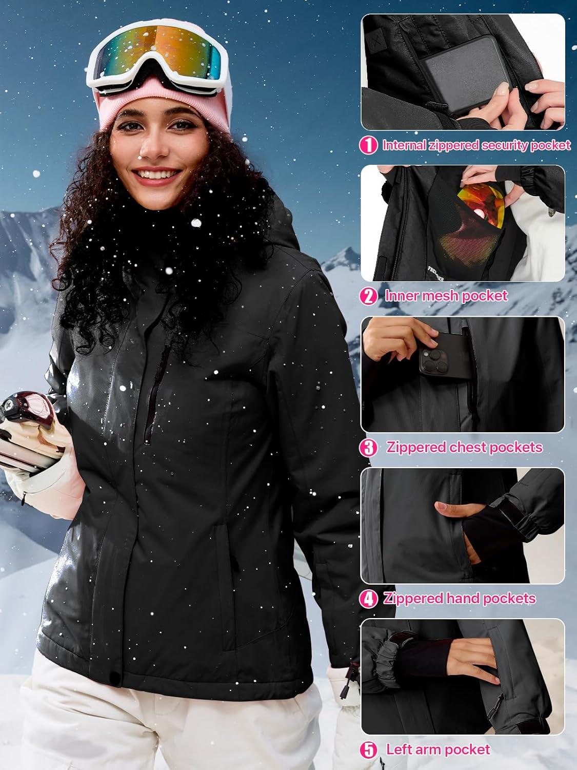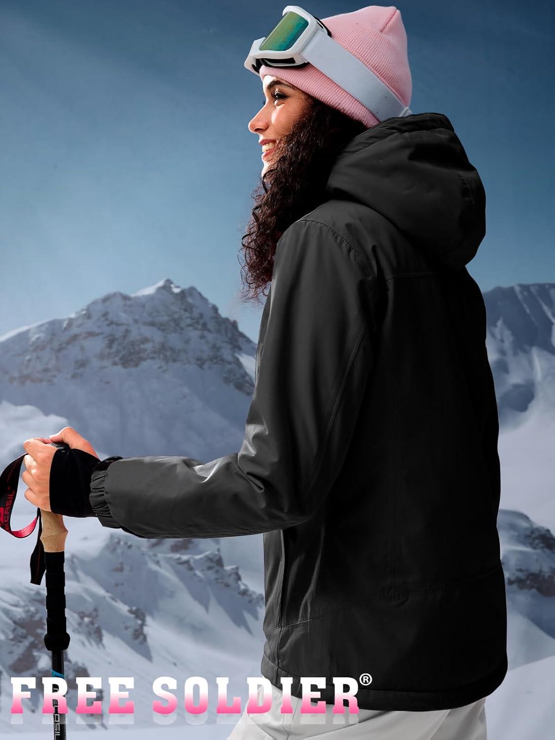 FREE SOLDIER Women's Waterproof Ski Snow Jacket Fleece Lined Warm Winter Rain Jacket with Hood Fully Taped Seams(Black)