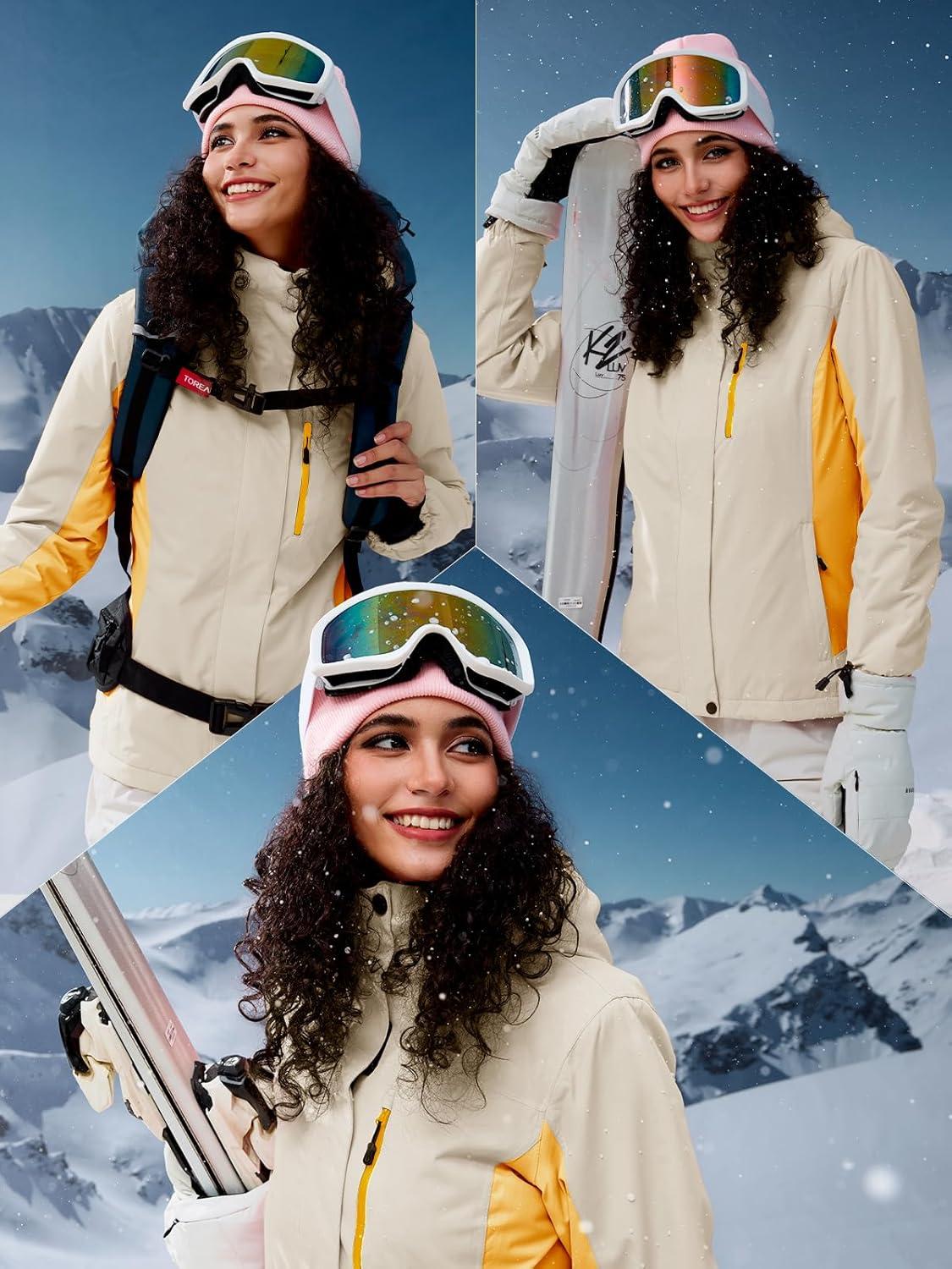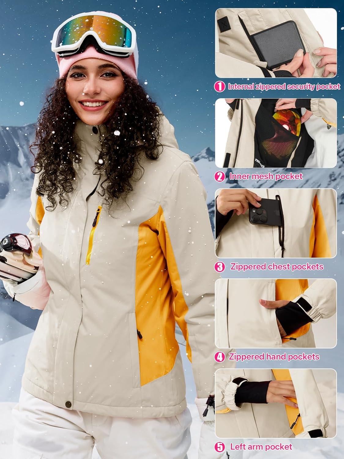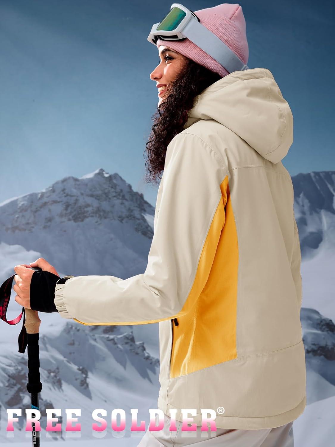 FREE SOLDIER Women's Waterproof Ski Snow Jacket Fleece Lined Warm Winter Rain Jacket with Hood Fully Taped Seams(Light Khaki/Ginger Yellow)