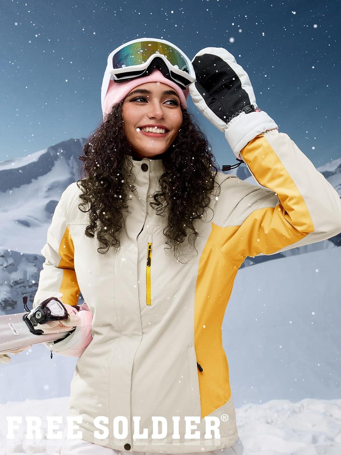 FREE SOLDIER Women’s Waterproof Ski Snow Jacket Fleece Lined Warm Winter Rain Jacket with Hood Fully Taped Seams(Light Khaki/Ginger Yellow)